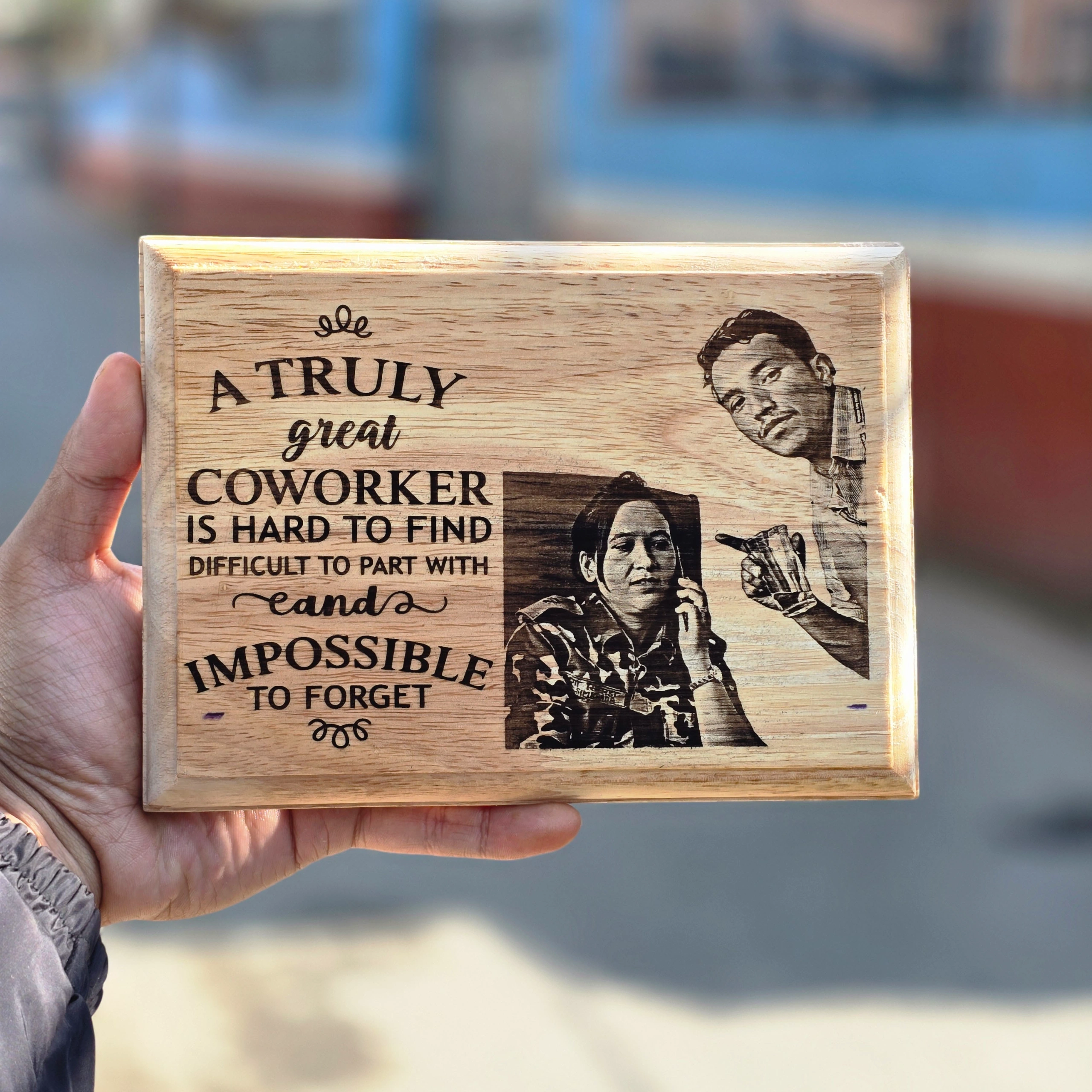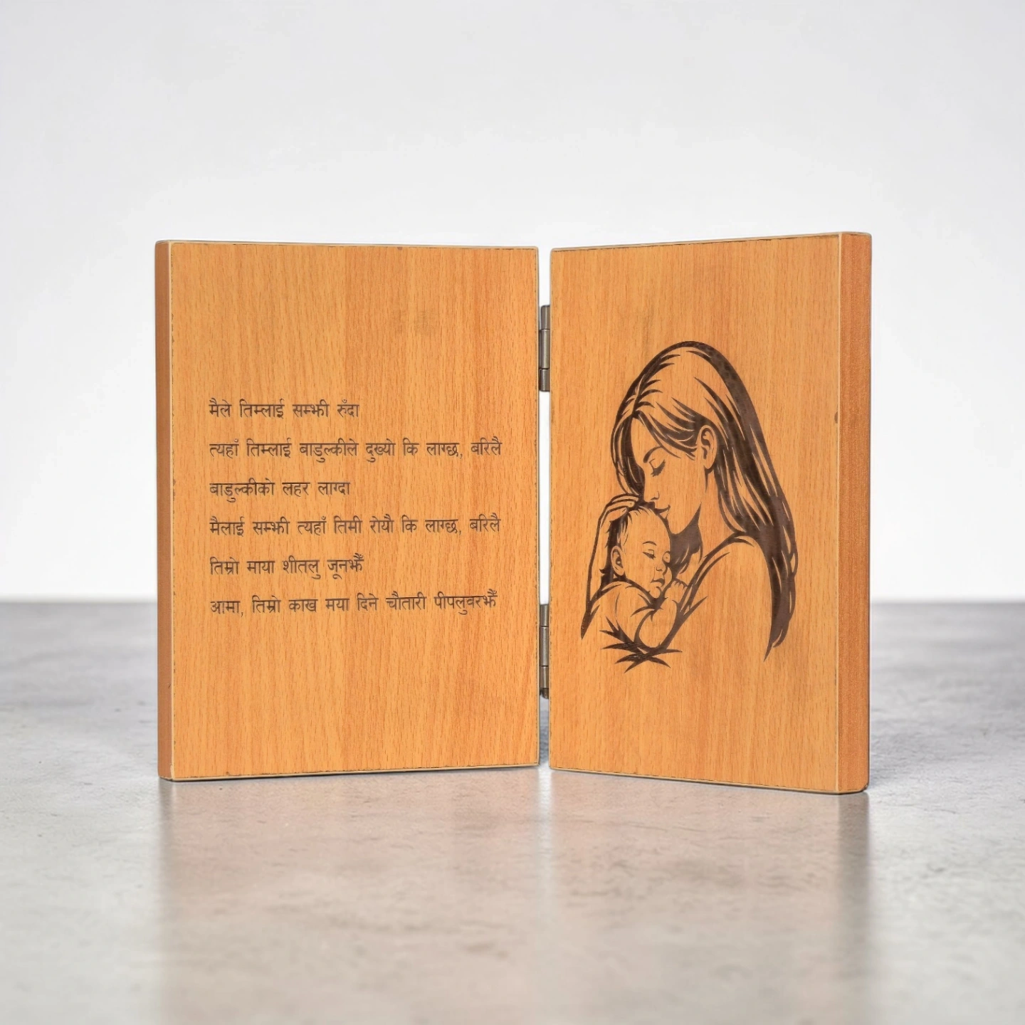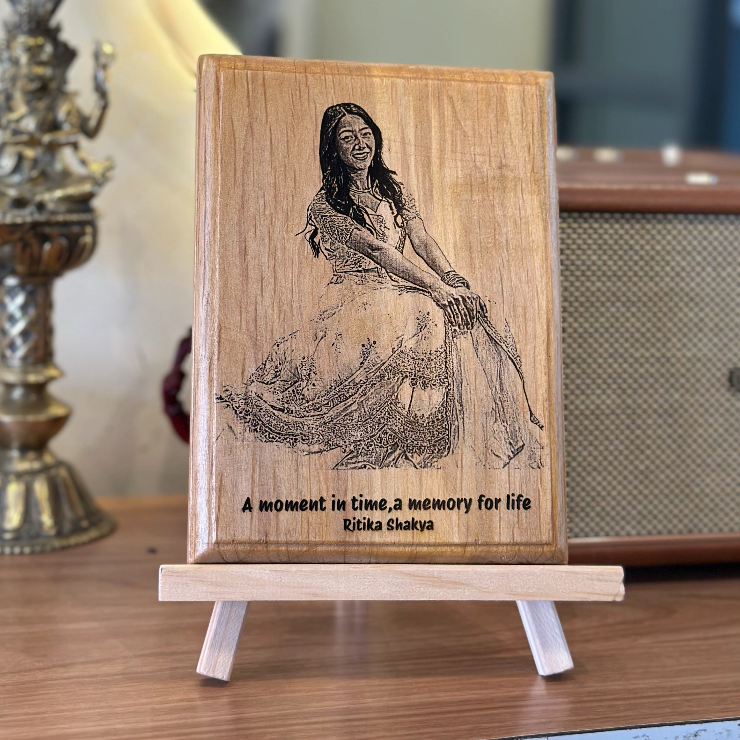 This 6×8 inch hinged wooden frame opens like a book — photo on one side, message on the other. You’ll receive a design preview before we engrave.