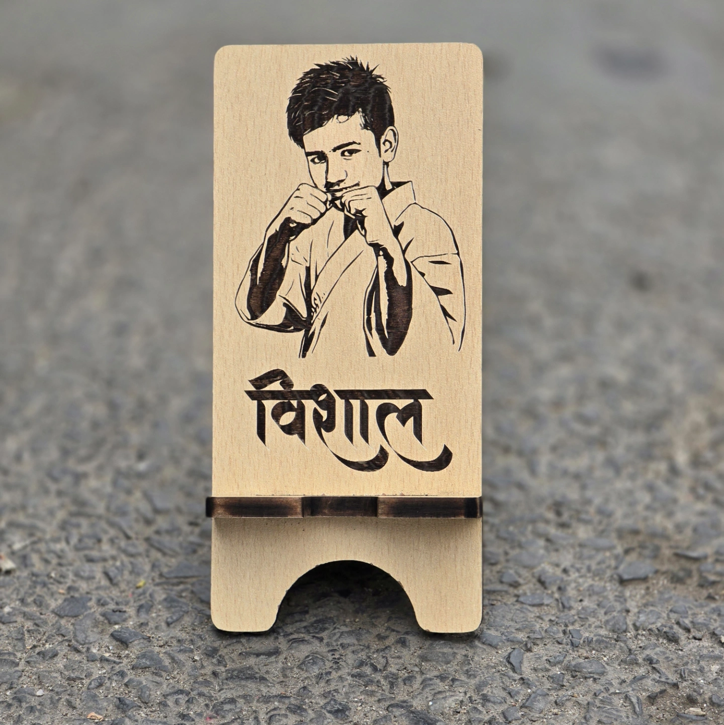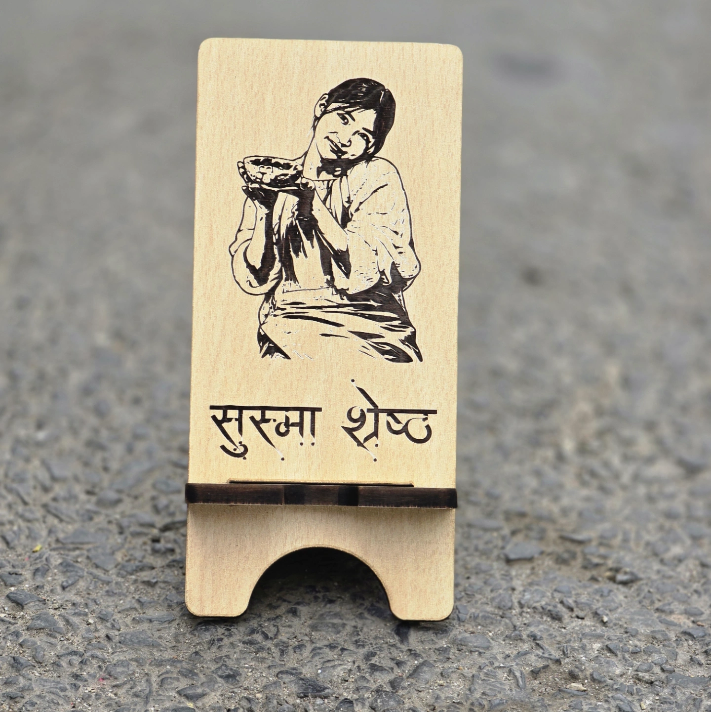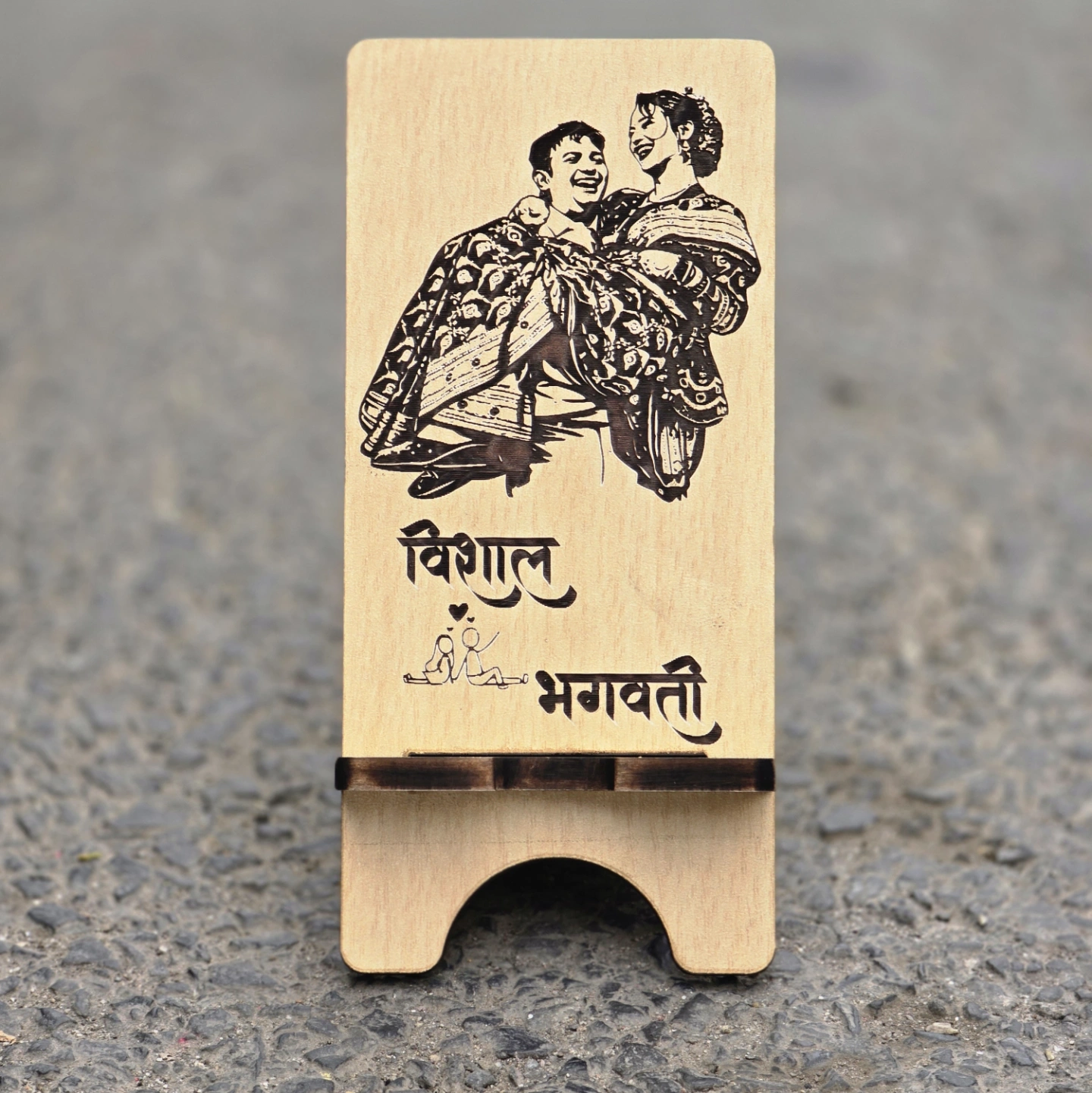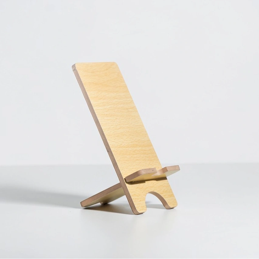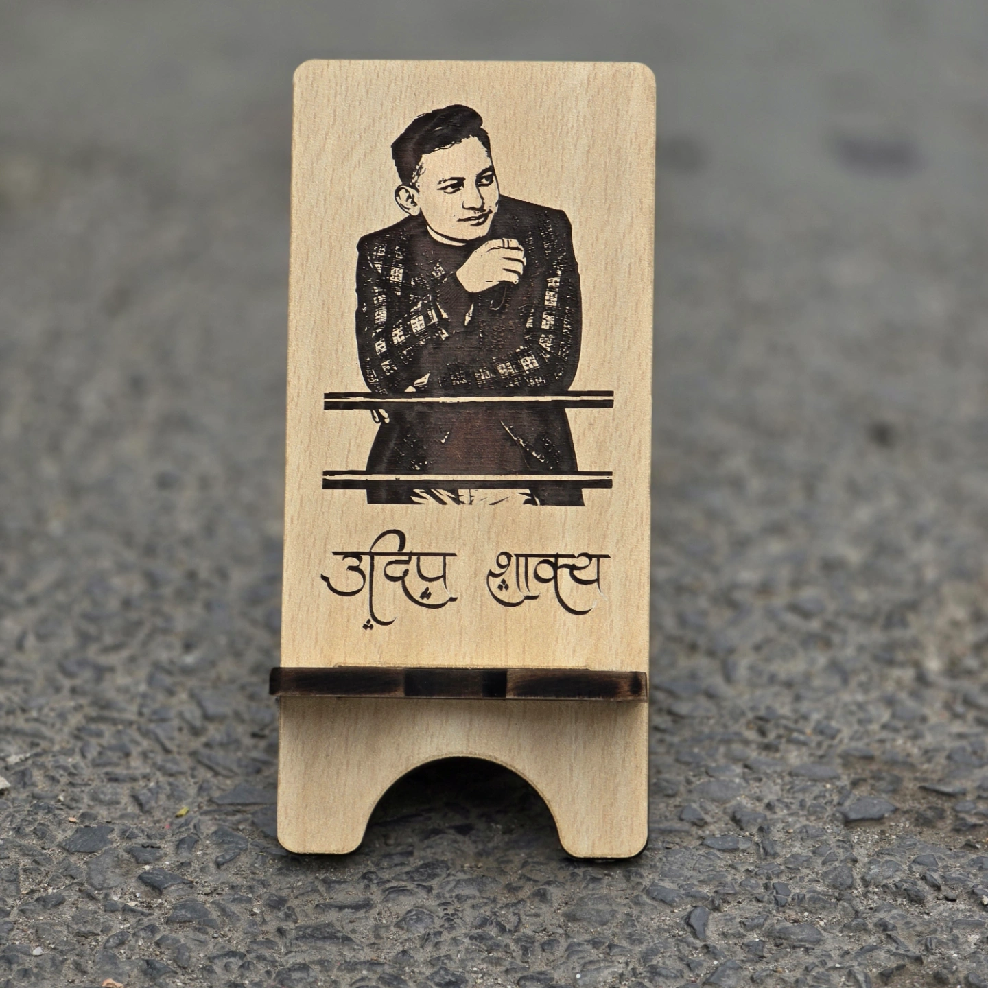 Personalized mobile stand made from prelam MDF and precision laser engraved with your photo, logo or message. A practical desk accessory and meaningful gift in one.