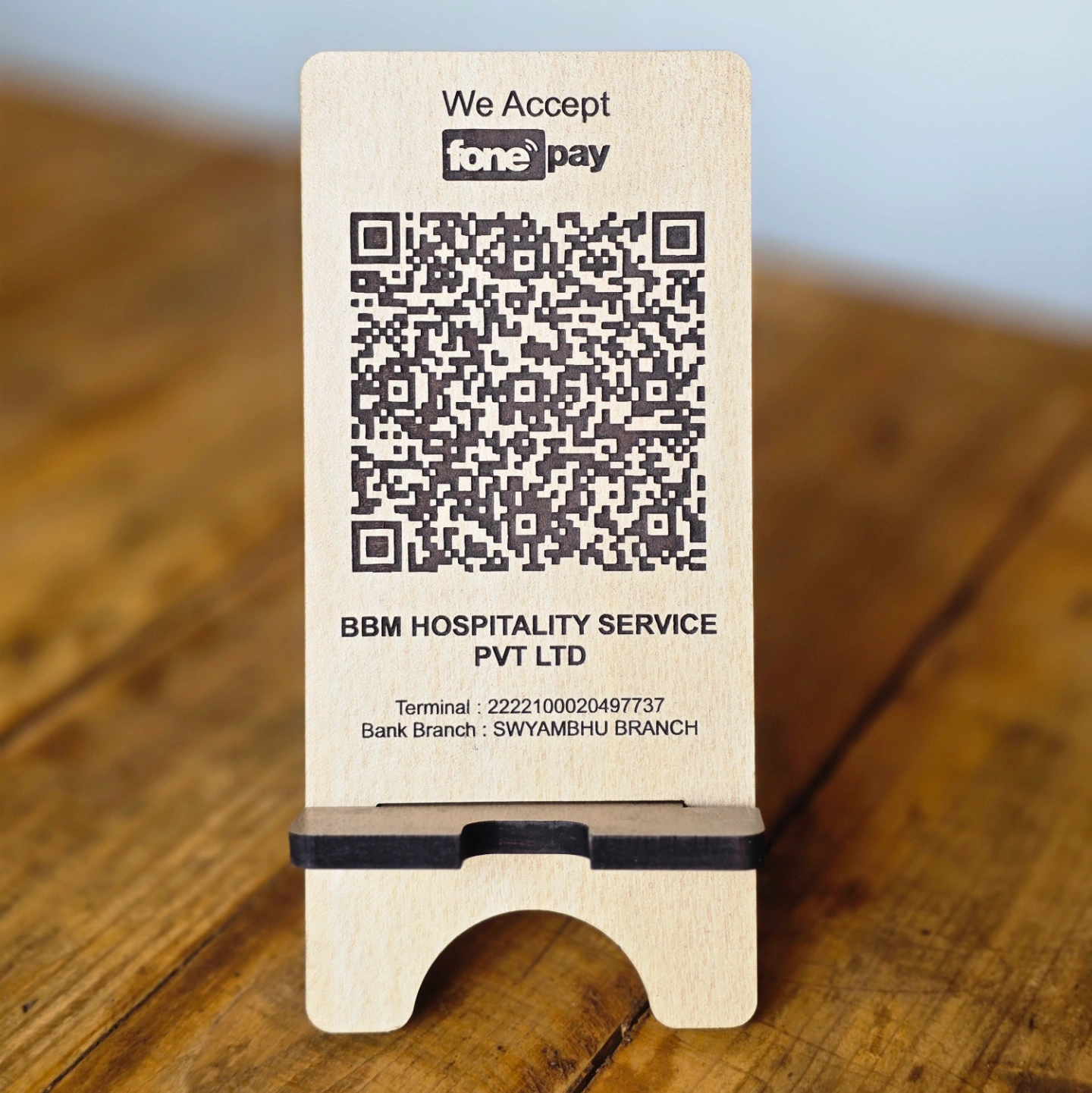This custom QR payment stand is crafted from strong prelam MDF and professionally laser engraved for a clean, permanent finish. Designed for businesses that accept digital payments such as Fonepay and other QR systems, this stand keeps your payment code clearly visible and easy to scan.