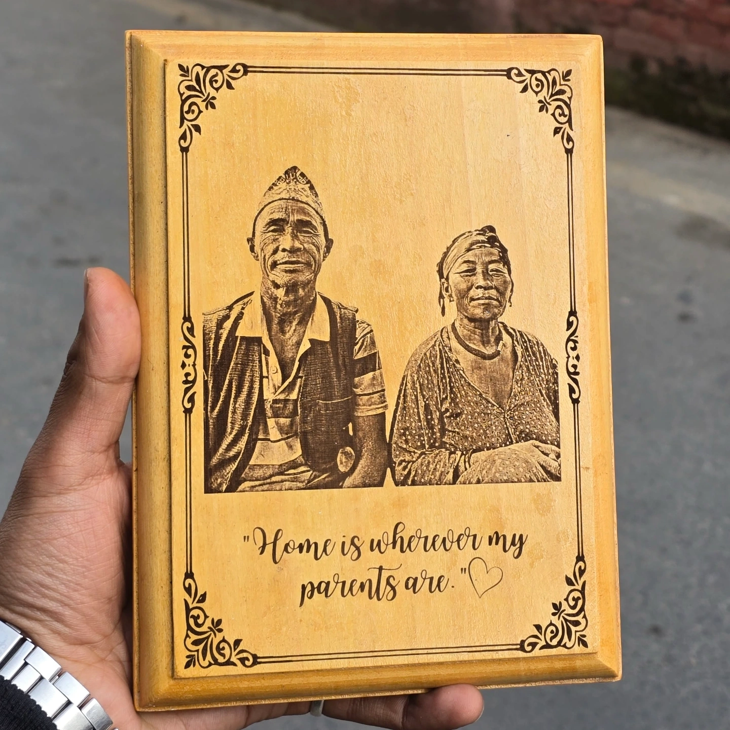 Premium laser-engraved wooden plaque made from natural Haldu wood. Fully customizable with photo, text, and design. Available in 6×8 inch and 8×12 inch sizes.