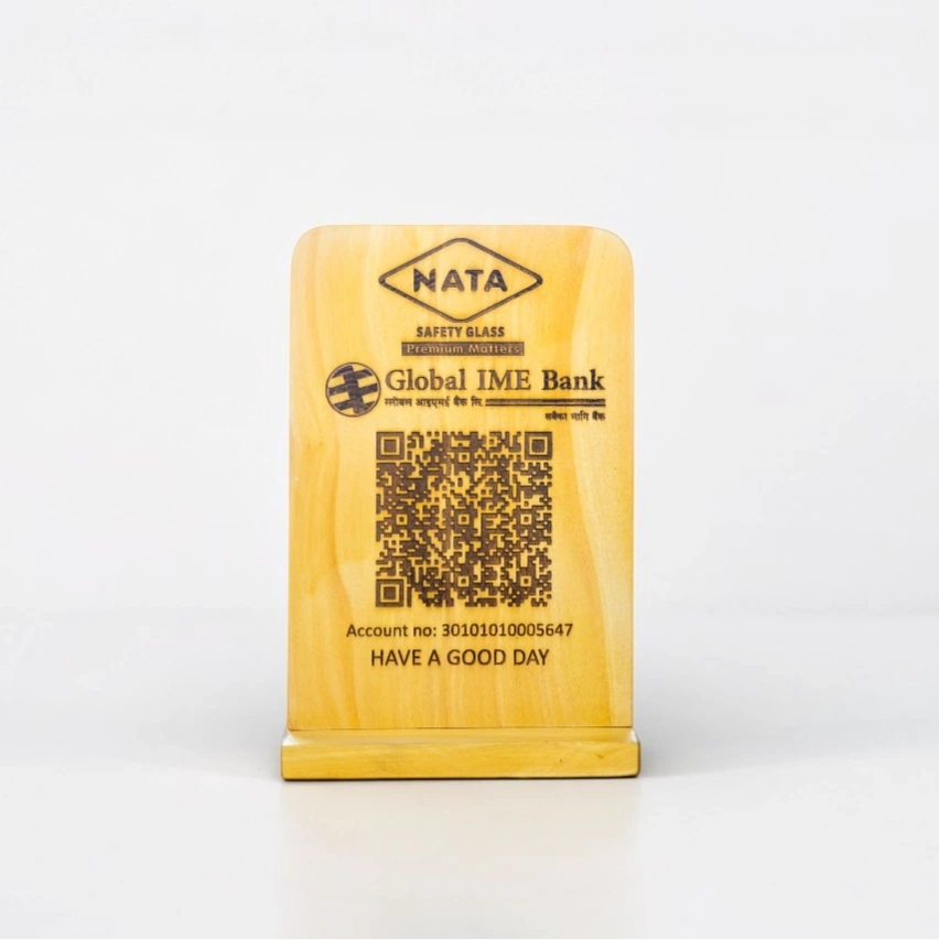 Upgrade your checkout counter with this 7.5 x 5 inch Haldu wood QR code payment stand, crafted for durability and premium presentation. Featuring precision laser engraving, this wooden QR stand is perfect for displaying digital payment options like eSewa, Khalti, and bank QR codes in shops, cafés, and restaurants.