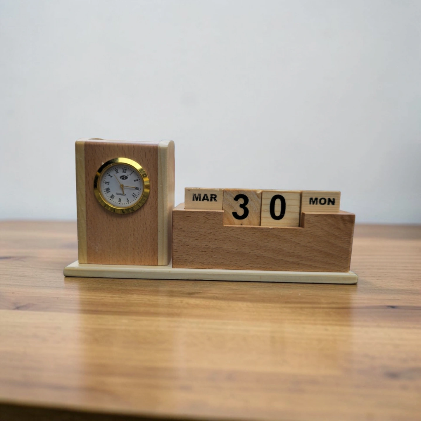 Crafted from high-quality wood, this timeless piece combines functionality with minimalist design. The analog clock keeps accurate time, while the manual calendar blocks add a classic touch to your desk.